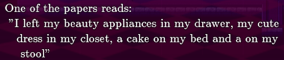 the dolls in the area start theyre sentences with one letter [like "o' olives omit objective"] piece together the letters in the correct order maybe.. thank you for playing :)